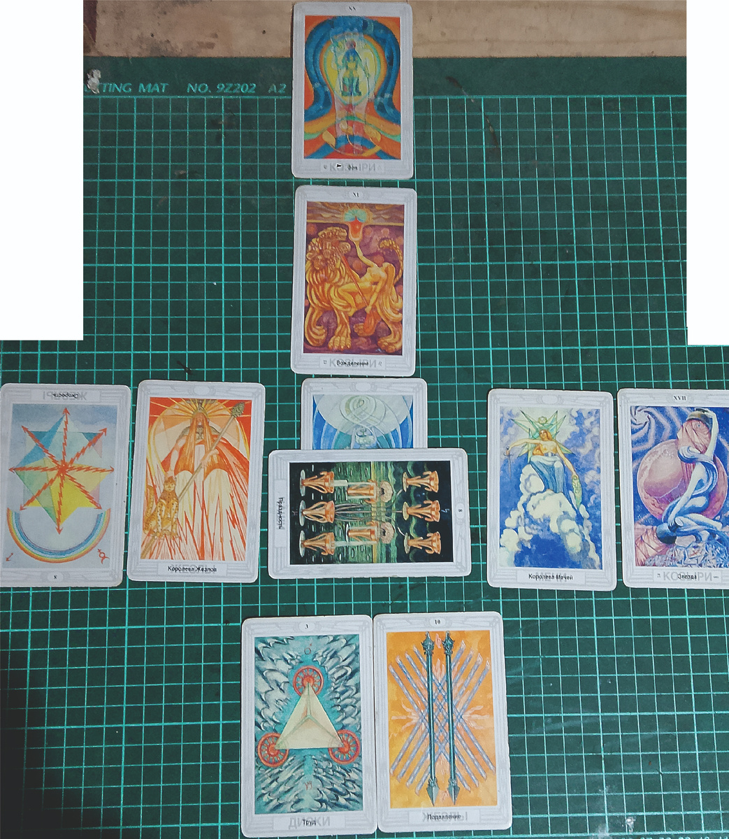 Когда встречаешься с новым человеком, точкой зрения, позицией, думаешь о них изначально хорошо. По первости, как правило, с восхищением. Не замечая отрицательного, теневых качеств. И, не то чтобы это твоя слабость, нет, скорее, как раз это сильное качество души. Боюсь сказать натуры, слишком ругательное это слово. Так вот, женщина, чей расклад перед Вами, всегда остаётся, каким-то образом, без второй, теневой части, всегда светлая, и все её слабости, каким-то образом, становятся её преимуществами. Если позволите, буду, обращаясь к Вам, иметь в виду её. Как будто в Вашем зеркале её отражение. Или вода - воды. Сплошные чувства. СтоИт это зеркало на трудолюбии и изношенном двигателе (желаний ещё много, а сил уже нет). Сейчас зима над озером, и мёрзнут Ваши чувства. Не в упрёк и не в назидание, просто, как скупая мужская позиция, пока вода не превратилась в лёд - ей нет преград. Ведь ваши поступки неудержимы и горячи. Название им - сила, а если смотреть шире, дверь в другой мир. Ваша ко