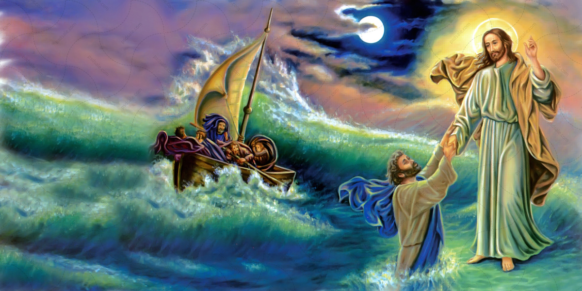 И, отпустив народ, Он взошел на гору помолиться наедине; и вечером оставался там один. А лодка была уже на средине моря, и ее било волнами, потому что ветер был противный. В четвертую же стражу ночи пошел к ним Иисус, идя по морю. И ученики, увидев Его идущего по морю, встревожились и говорили: это призрак; и от страха вскричали. Но Иисус тотчас заговорил с ними и сказал: ободритесь; это Я, не бойтесь. Петр сказал Ему в ответ: Господи! если это Ты, повели мне прийти к Тебе по воде. Он же сказал: иди. И, выйдя из лодки, Петр пошел по воде, чтобы подойти к Иисусу, но, видя сильный ветер, испугался и, начав утопать, закричал: Господи! спаси меня. Иисус тотчас простер руку, поддержал его и говорит ему: маловерный! зачем ты усомнился? И, когда вошли они в лодку, ветер утих (Мф.14:23-32).