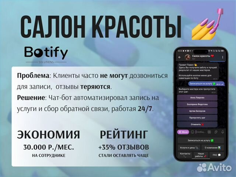 Автоматизация процессов, экономия ресурсов и рост продаж — ключевые задачи современного бизнеса. Мы, команда Bоtify, вот уже 2 года помогаем компаниям решать их с помощью умных чат-ботов. Наша разработка — это не просто программирование, а комплексное решение "под ключ", включая техническое задание, разработку, документацию, деплой и поддержку. Хотите знать, как ваши конкуренты уже зарабатывают больше благодаря чат-ботам? Мы расскажем и покажем! Наши чат-боты — это не просто программы, это виртуальные ассистенты, которые работают за вас 24/7. Они автоматизируют рутинные задачи, экономя ваше время и деньги. Клиенты получают мгновенные ответы, а вы — повышенную конверсию и рост продаж. Представьте себе салон красоты, где запись на услуги происходит автоматически, а отзывы собираются сами собой. Мы уже реализовали такой проект, и это принесло экономию в 30 000 рублей в месяц и увеличение отзывов на 35%. В другом случае мы интегрировали чат-бота с CRM-системой Битрикс24, что повысило колич
