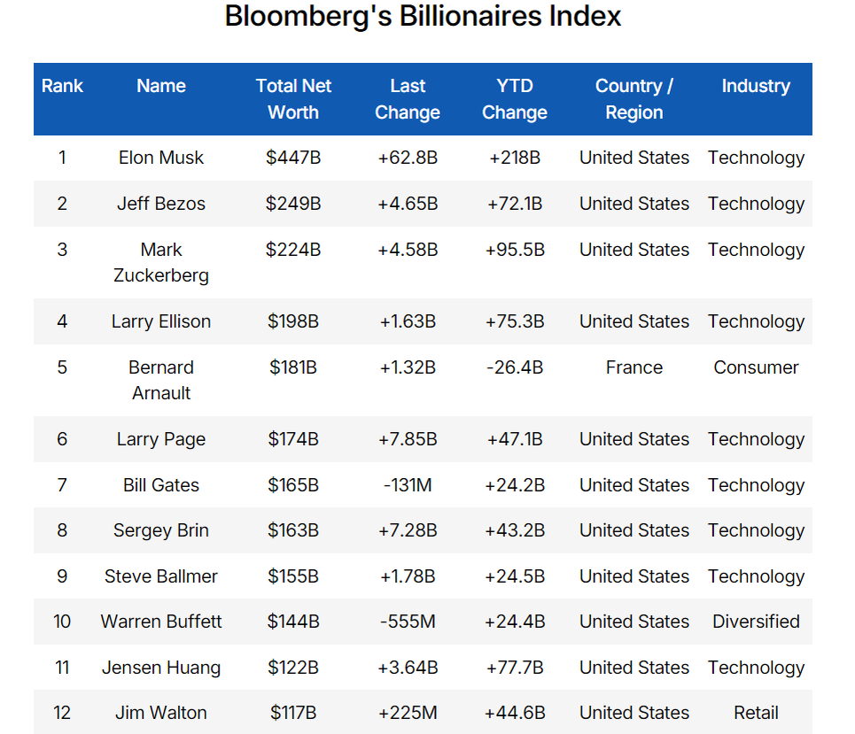 Илон Маск, являющийся главой компании Tesla, теперь не просто самый богатый человек в мире, а самый богатый человек в мире с большим отрывом от ближайшего преследователя. Чистый капитал руководителя Tesla достиг 447 миллиардов долларов, что сделало его первым человеком, когда-либо преодолевшим рубеж в 400 миллиардов долларов. Согласно индексу миллиардеров Bloomberg, состояние Маска в этом году увеличилось на невероятные 218 миллиардов долларов. Рост почти такой же, как целое состояние у второго места Джеффа Безоса и третьего места Марка Цукерберга: 249 миллиардов долларов и 224 миллиарда долларов соответственно. Состояние Маска резко возросло после выборов в США в ноябре, увеличившись на 77%. Сумма включает в себя однодневный рост на 62,8 миллиарда долларов после того, как SpaceX и ее инвесторы согласились купить инсайдерские акции на сумму 1,25 миллиарда долларов, что оценило компанию примерно в 350 миллиардов долларов. Будучи крупнейшим индивидуальным акционером Tesla, Маск также выи