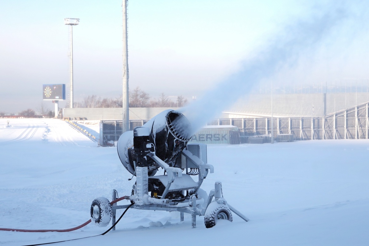 В спортшколе олимпийского резерва по зимним видам спорта полным ходом идёт подготовка к предстоящим IV Российско-Китайским молодёжным зимним играм. На территории лыжно-биатлонного комплекса «Триумф» приступили к оснежению лыжных трасс. В январе здесь в рамках крупных международных стартов пройдут соревнования по лыжным гонкам и лыжному двоеборью. - При поддержке правительства Сахалинской области мы приобрели два снегогенератора. С их помощью мы уже полностью подготовили стадион и штрафной круг. Здесь толщина снежного покрытия составляет 40 сантиметров. Наша задача – за три дня оснежить ещё километр трассы и продолжать в том же темпе. Мы внимательно следим за погодными условиями – пока осадков не предвидится. Поэтому без нового оборудования подготовиться к Играм было бы гораздо сложнее, - поделился подробностями директор СШОР зимних видов спорта Михаил Шамсутдинов. Один снегогенератор, в зависимости от погодных условий, может создавать от 5 до 25 кубических метров снега в час. Чем на ул