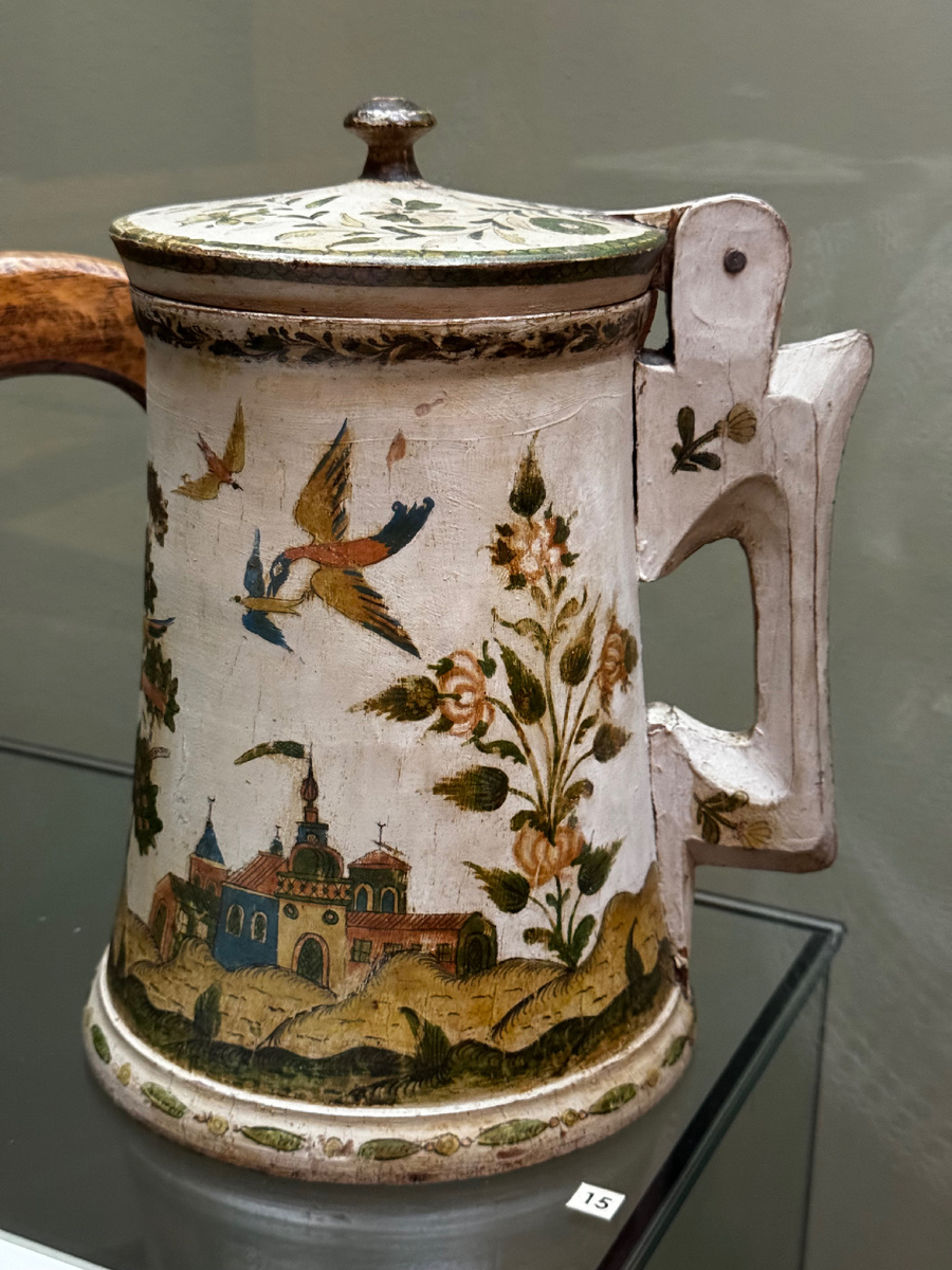 Приветствую. Я посетила Государственный Исторический Музей — далее ГИМ. Экспонаты музея конечно поражают воображение, поэтому сегодня обсудим находящуюся в экспозиции посуду из мастерских крестьян на Русском севере и изделия из олова для знаменитого сословия. Кружка. Россия, 18 век. Дерево, точение, резьба и роспись Ковшик-черпачок. Поволжье, Космодемьянский тип. 18 век Ковшик-черпачок. Вологда. Бутыль-ведерная. Россия. Роспись библейский сюжет Ковш. Костромская губерния Солоница. Вологодская губерния солонка-братинка, солонка в виде лебедя, ложка, солонка-перечница, кружка с откидной крышкой, стакан, кувшин-оловейник, блюдо, супница-шар. Мастера: Григорий Васильев, Потап Иванов, Антип Осипов-Перекислов, Устин Петров, Гаврила Андреев. Изделия из меди: кувшин, стопа, стакан. Закончу статью посудой честь заключения мира. Кружка с медалью, в честь заключения Ясского мира 1791 год. Гданьск. Конец 17 начало 18 века. Мастер Иоган Раде.