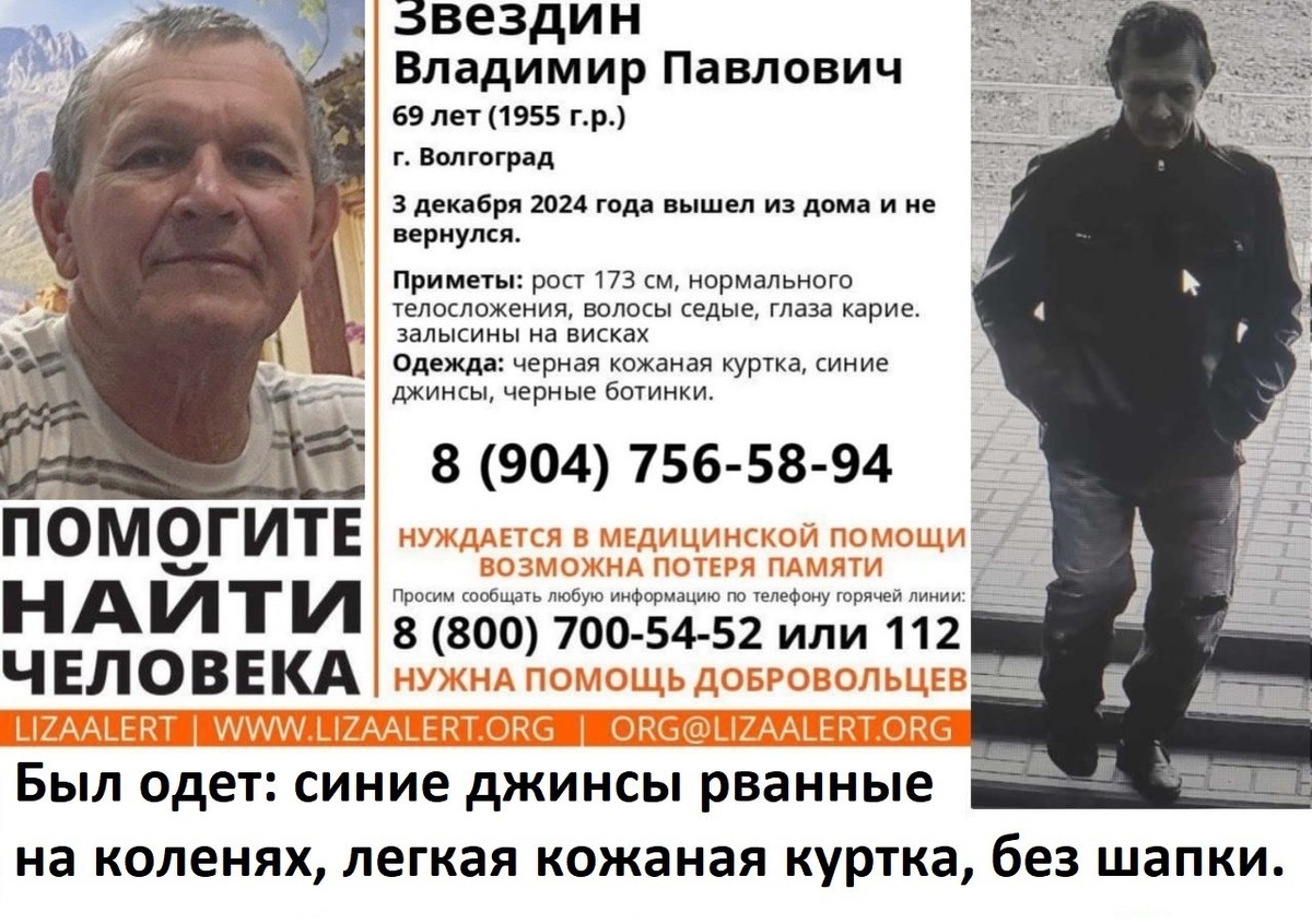 В Волгограде и области продолжают искать 69-летнего Владимира Звездина, который пропал без вести 3 декабря. Подробности исчезновения рассказали родные мужчины. По их словам, десять дней назад он отправился в магазин «Лента» на Третьей продольной на Космонавтов, 30, куда Владимир Павлович часто ходил с женой. Мужчина вышел из дома немного быстрее супруги, а когда волгоградка отправилась за ним, его уже нигде не было. В последний раз камеры зафиксировали Владимира Звездина на проезде Геофизиков. Родные полагают, что он мог пойти вглубь промзоны. Мужчина был одет в легкую кожаную куртку, рваные на коленях джинсы, на нем не было шапки. Он может страдать потерей памяти. Поиски продолжаются. Ранее волонтеры обратились к автомобилистам. — Поисковый отряд «ЛизаАлерт» обращается к водителям, которые могли проезжать по маршруту шосее Авиаторов, 10Б (автомойка самообслуживания) — шоссе Авиаторов, 1 в период с 17:30 вечера 3 декабря 2024 года. Просим вас просмотреть записи с регистраторов или пр