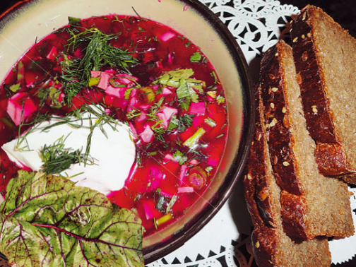 Ещё один интересный вариант – холодный свекольник. Для его приготовления используют варёную свёклу, кислые ягоды (клюква, брусника), зелень, сметану и уксус. Свекольник — насыщенный и пикантный суп, который хорошо утоляет жажду и обогащает организм витаминами.