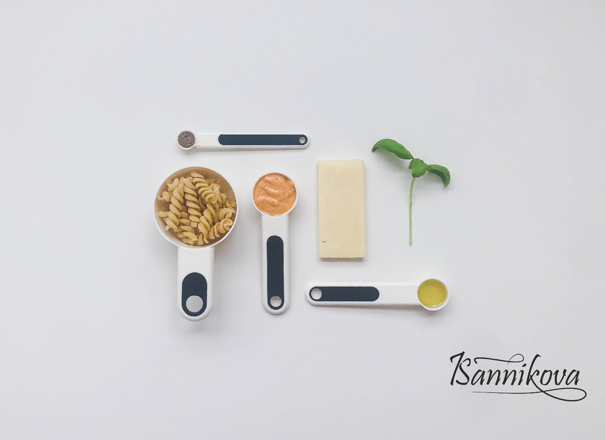 2. паста с соусом песто из болгарского перца готова, сверху посыпаем пармезаном и украшаем базиликом