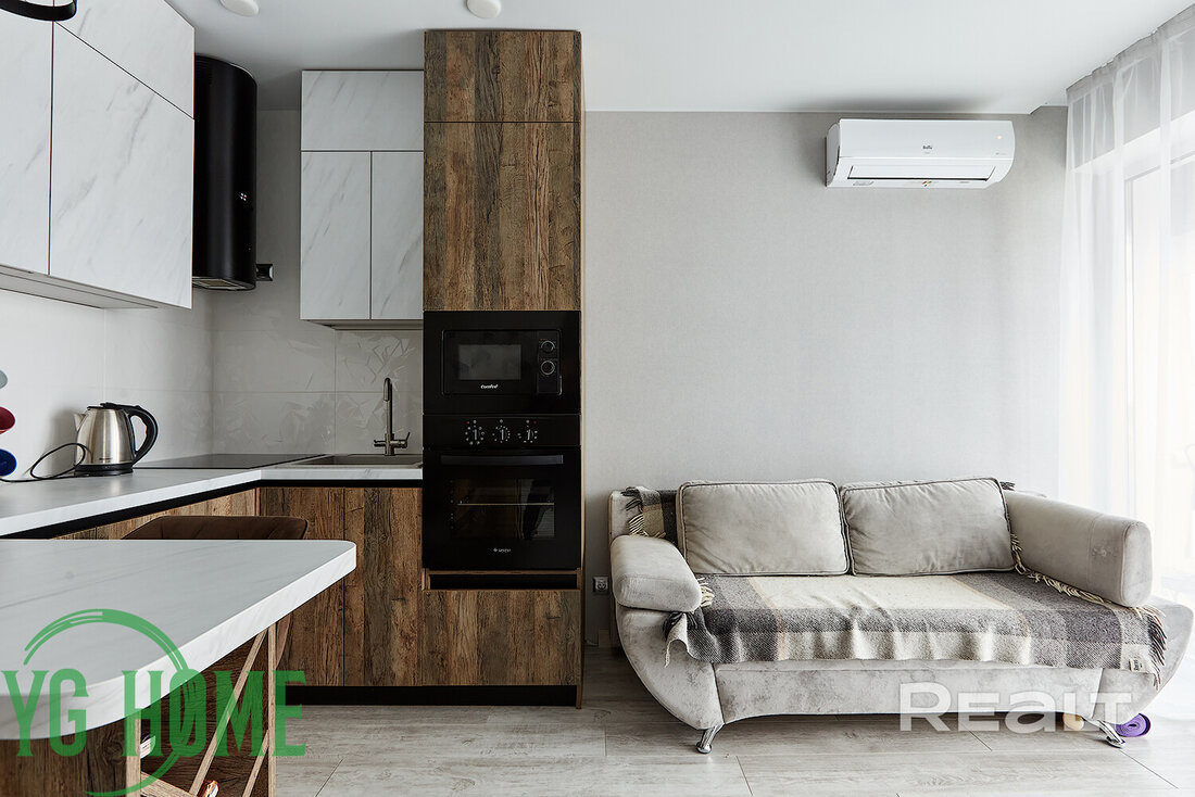 Общая площадь — 31 квадрат. В квартире стильный ремонт в светлых тонах. В зоне гостиной стоит диван, установлен кондиционер и выведены розетки под телевизор на стену. Кухонные фасады выполнены в белом цвете и цвете дерева. Из техники есть духовой шкаф, микроволновка, варочная панель и вытяжка.