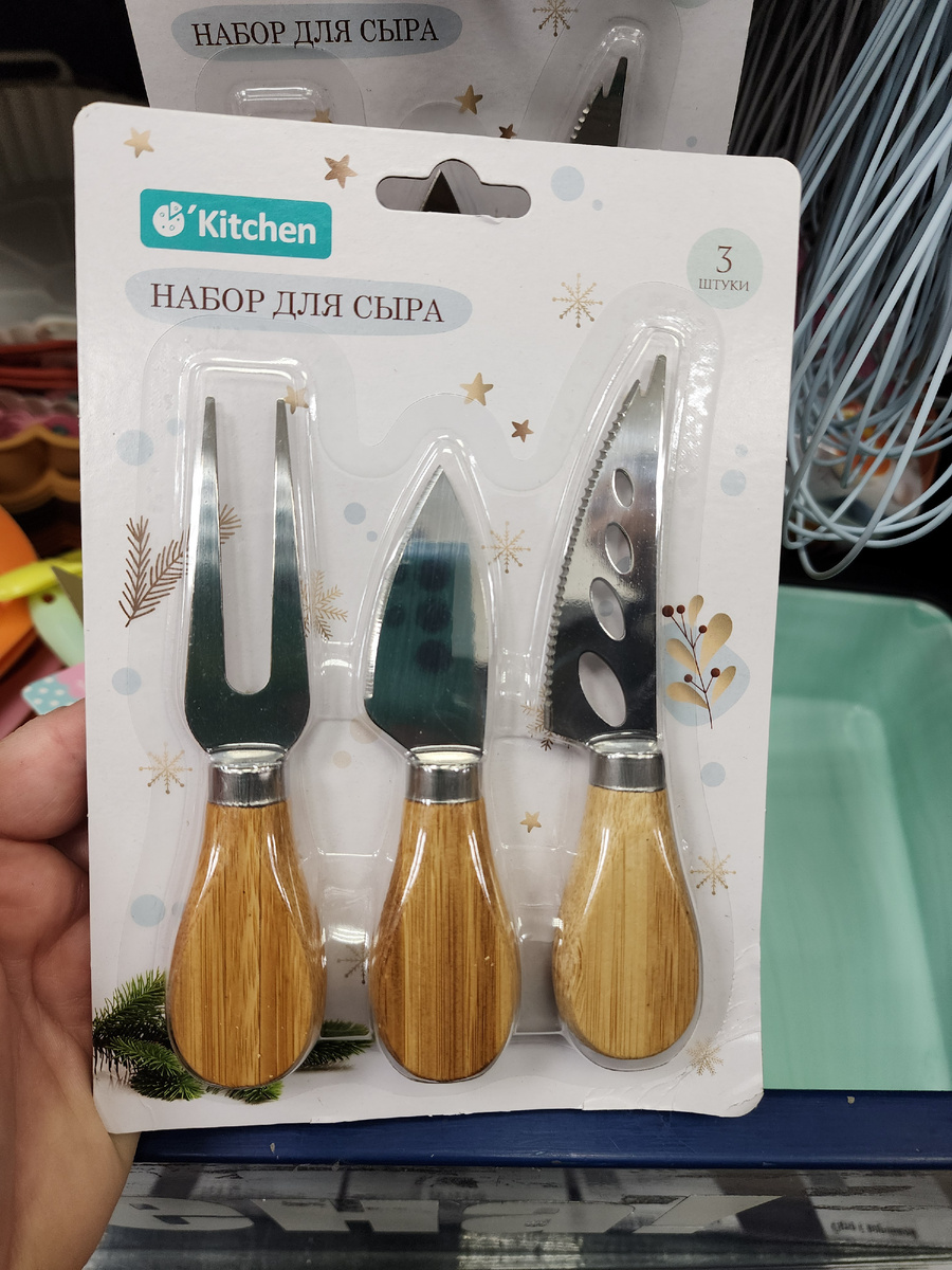 В набор входит: вилка для сыра, нож для твёрдого сыра, нож для мягкого сыра.