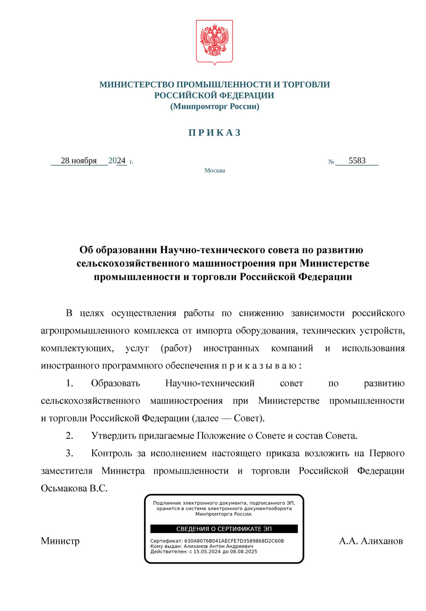 Об образовании совета по развитию сельскохозяйственного машиностроения при Минпромторге