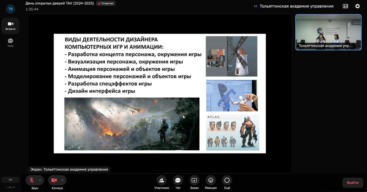 12 декабря в Тольяттинской академии управления состоялся третий день открытых дверей в онлайн-формате! Наталья Борисовна Стрекалова, ректор, заведующий кафедрой прикладной информатики и высшей математики, и Елена Владимировна Вишневская, проректор по научно-исследовательской работе, заведующий кафедрой дизайна, рассказали о профилях обучения по двум направлениям подготовки 09.03.03 Прикладная информатика и 54.03.01 Дизайн, о дисциплинах и навыках, которые осваивают студенты Академии в ходе обучения. Посмотреть запись и презентацию можно по ссылке: https://disk.yandex.ru/d/ceIxWVHJY5oE4Q.