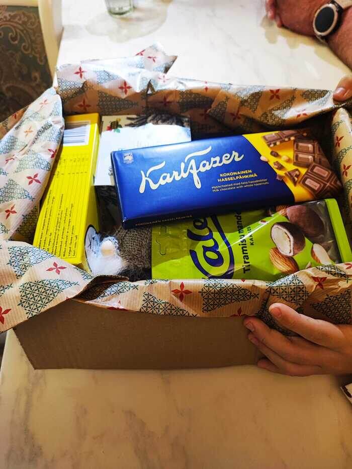 Похоже я действительно в этом году вела себя хорошо)). Мне достался (или я досталась))) чудесный Дедушка Мороз Александр из Санкт-Петербурга. При сообщении об отправке подарка, он оставил послание. В котором хотел рассказать " что для чего, но заранее ничего не спойлерить!" Но тем самым еще больше заинтриговал)). Поэтому мой подарок с нетерпением ожидала не только я, но и мои коллеги, которым я прочитала послание.)) При распаковке подарка присутствовала вся семья, включая 2х котов. Но про фотоотчет вспомнили, когда уже открыли подарок. Ибо ну оччччень было интересно, что внутри. Муж, который делал незаинтересованный вид, подсел почему-то поближе)). А загребущие лапки дочери сразу же вцепились в коробку))) А теперь по порядку. Ну во-первых вкусняшки, как знал, что я люблю с орехами, а миндаль особенно). И вкусняшки то какие- все заморские, загранишные))) Во-вторых, чай, а я пью чай только травяной. Ну и далее по списку, по интригующим места из записки: Про новогоднюю игрушку, цитирую -о
