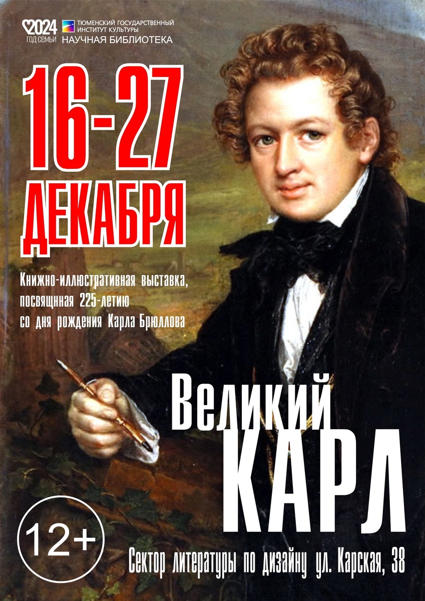 16 декабря в секторе литературы по дизайну (ул. Карская, 38, ауд. 302) научной библиотеки ТГИК открывается книжно-иллюстративная выставка «Великий Карл», посвящённая 225-летию со дня рождения Карла Брюллова (1799–1852)