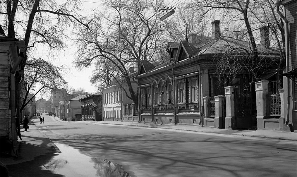 Теперь мы на улице Чаплыгина, это недалеко от Чистопрудного бульвара. В этих квартала тогда тоже ещё можно было найти деревянные домики среди каменных особняков. Кстати, в здании слева тогда работала булочная-кондитерская. Фото 1970-75 годов