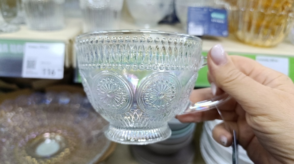 Салатники 149 руб., кружки, стаканы, выполненные в том же стиле. Даже бутыль переливается всеми цветами радуги.