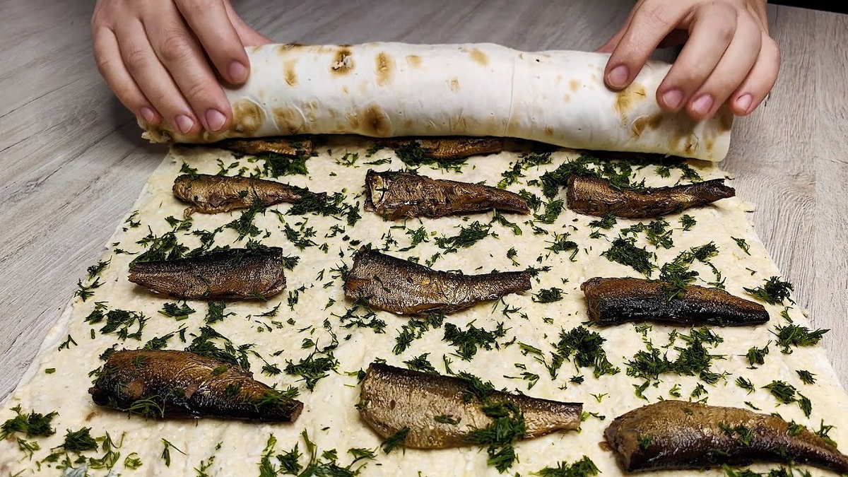 Ингредиенты Берём шпроты и отрезаем у каждой рыбки хвостики. Мелкую тёрку смазываем растительным маслом и натираем 2 плавленных сырка. Тертый сыр пересыпаем в миску. Яйца так-же натираем на мелкой тёрке и пересыпаем к сыру. Картошку тоже натираем на мелкой тёрке и добавляем в общую массу. Натираем 2 зубчика чеснока и добавляем в миску. Солим, перчим и заправляем майонезом. Свежие огурцы нарезаем тонкими слайсами, при помощи овощичистки. Делим лаваш на 2 прямоугольника, на 1 часть выкладываем половину начинки и распределяем по всему лавашу. Сверху по всему лавашу, рядами выкладываем огурцы и накрываем 2 листом лаваша. Промазываем лаваш оставшейся начинкой и рядами выкладываем рыбку. Сверху посыпаем измельчённым укропом , 1 край промазываем майонезом, а другой край заворачиваем в рулет. Заворачиваем закусочный рулет в пищевую плёнку и отправляем в холодильник на 1 час. Достаем из холодильника , нарезаем и подаём к праздничному столу! Видео рецепт здесь 👇