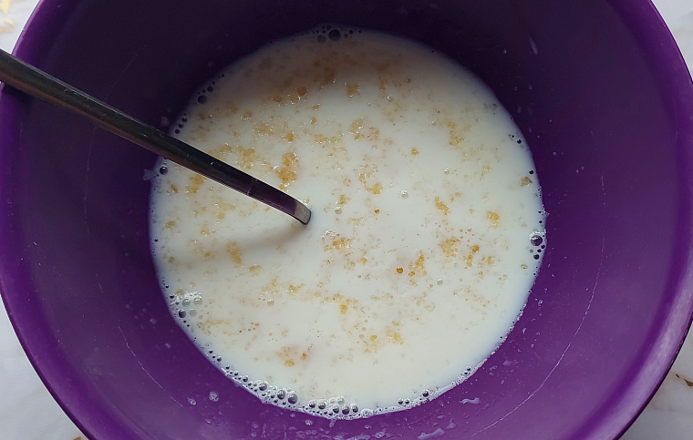 Для основы: Для начинки: Начнём приготовление. Желатин высыпаем в чашу, вливаем 100 мл воды и 100 мл молока в желатин. Оставляем набухать минут на 20.