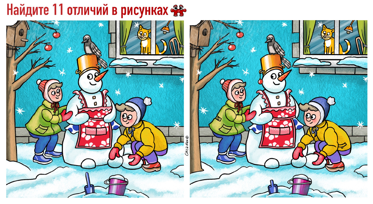 Сегодня отличия спрятались на картинках с добрым зимним сюжетом из детства. Наверное каждому знакомо - мороз, настроение прекрасное, снежок хрустит, и домой мама не может загнать пока снеговика не долепишь. Дети слепили симпатичную снежную красавицу в бабушкином фартуке. Теперь можно и на обед! Горизонтальная картинка: Вертикальная картинка: Ответ: