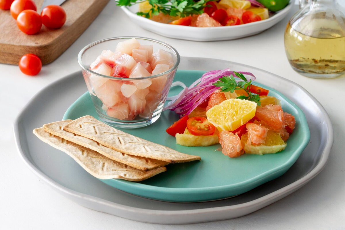 В центр положите копченую рыбу, вокруг неё — оливки и разрезанные пополам помидоры черри.