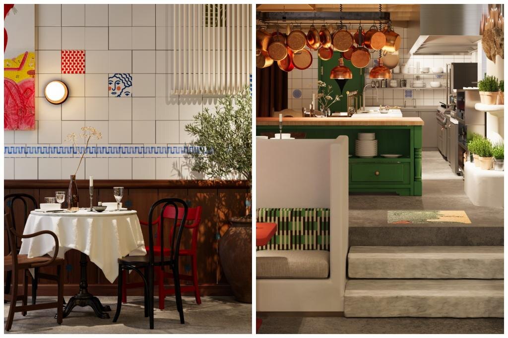 Задумка интерьера — передать энергетику и ощущение бесконечного праздника. Внутри: ручная роспись на настенной плитке, римско-византийские орнаменты из мозаики, стол из стога сена в центре зала и плетеные корзины с рассадой трав. При входе команда обещает обустроить нарядную витрину с амюзбушами, выпечкой и домашними ликерами. По выходным витрину будут трансформировать в прилавок с рыбой, фермерскими фруктами и овощами.