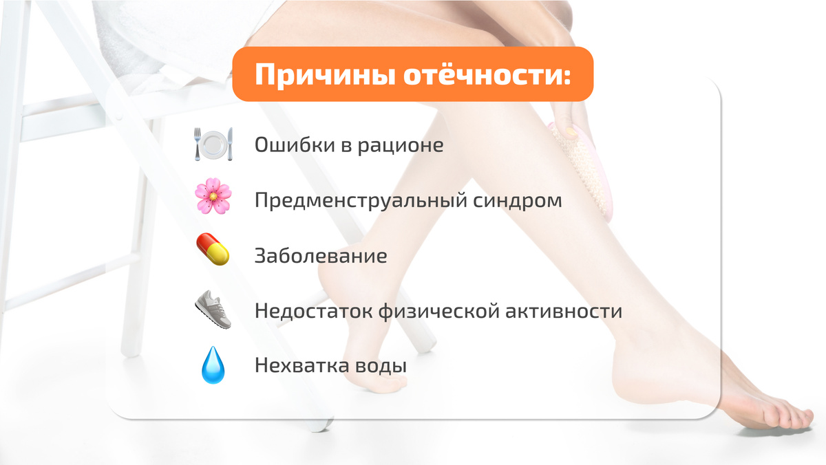 Отёк — досадная задержка воды в организме, которую часто путают с лишними килограммами. Почему он возникает? Сейчас расскажу про 5 основных причин. 💧 Ошибки в рационе Например, в нем много продуктов с высоким содержанием натрия. Или, наоборот, не хватает мочегонных продуктов. Но не принимайте мочегонные препараты без совета врача! 💧 Предменструальный синдром Где-то за неделю до менструации у женщины может увеличиться вес примерно на 1-3 кг, но всё индивидуально. Перед циклом меняется уровень гормонов в организме, что вызывает задержку воды и отеки. 💧 Заболевание Иногда отеки могут сигнализировать о нарушении работы щитовидной железы, сердца, почек, о воспалительном процессе. Поэтому если у вас возникли сомнения, лучше провериться у врача. 💧 Недостаток физической активности Это особенно частая история для всех, у кого работа сидячая. Когда движения в течение дня не хватает, застаивается лимфа и возникают отеки. 💧 Нехватка воды Как ни странно, нехватка жидкости ведет к ее застою в о