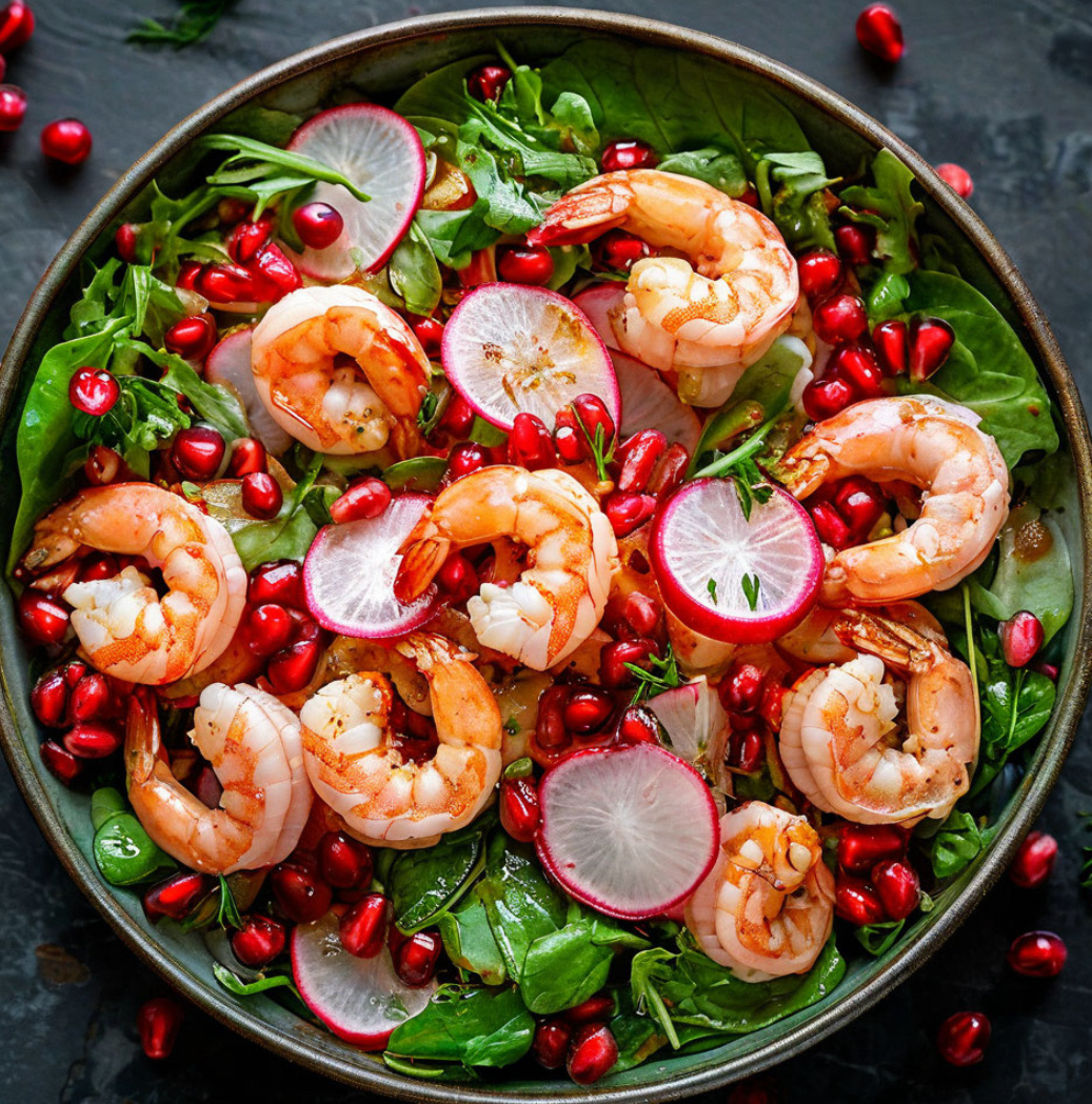 - Заправьте салат половиной приготовленной заправки. Выложите подготовленные креветки сверху и полейте оставшейся заправкой. Посыпьте зернами граната и подавайте к столу.
