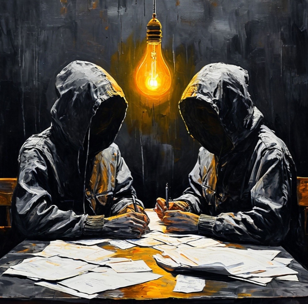 Как только я нырнула в эту неосязаемую черноту произошли две вещи. Во-первых, старик стремительно закрыл за нами дверь, отсекая единственный источник света из коридора так, будто свет мог навредить нам обоим. А во-вторых, как только мир наш погрузился во мрак, перед нами возникло некое подобие пузыря, внутри которого стоял один единственный совершенно обычный письменный стол с тусклой, мерцающей жёлтым светом лампой посередине. Два человека сидели за тем столом одетые в черные невзрачные костюмы, но с осанкой достойной разве что учеников балетной школы. Но не от их внешнего вида у меня перехватило дыхание, и не от того, как внезапно появились эти две похожие на кукол фигуры, а от того, что ни у первого ни второго не было лица. Ощущение словно кто-то обладающий божественной волей намеренно стёр с их лиц бесконечную кривую ухмылку ластиком. Ни глаз, ни носа, ни рта.
