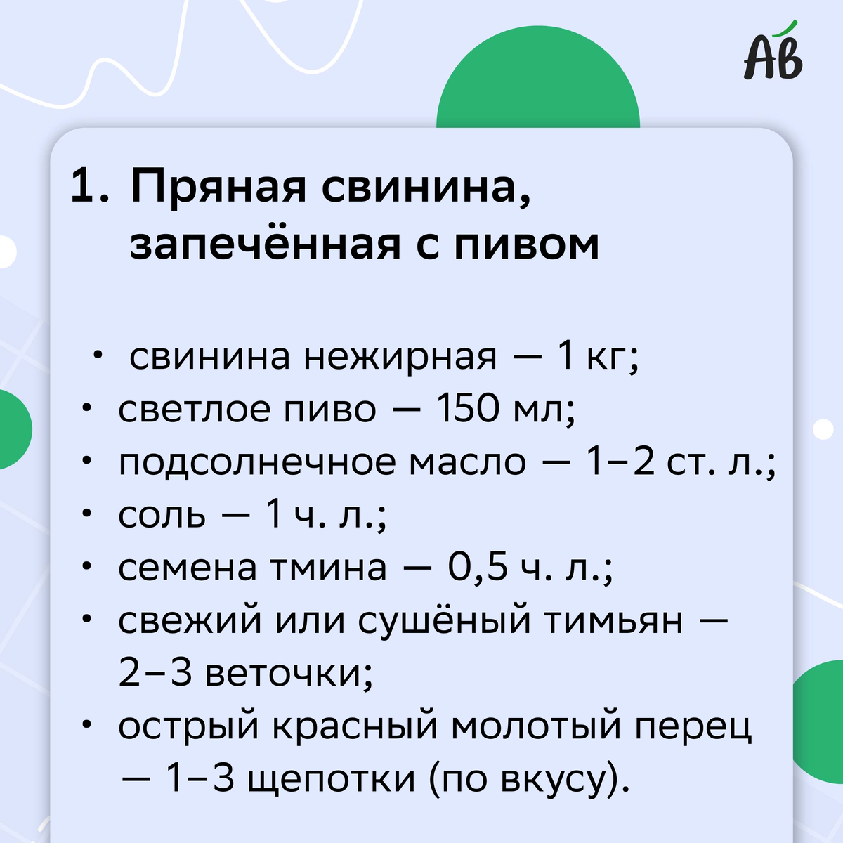 Друзья, Новый год — это отличный повод порадовать близких вкусными и необычными блюдами. Мы собрали для вас три оригинальных рецепта, которые украсят ваш праздничный стол и подарят настроение уюта и тепла. ✨ Список ингредиентов вы найдёте на карточках, а подробный способ приготовления — ниже. Готовьте с удовольствием и удивляйте гостей! 🍴🎉 Пряная свинина, запечённая с пивом 1️. Свинину вымойте, обсушите салфеткой. Если есть жировая прослойка, нарежьте её квадратами. 2️. Свинину натрите солью, перцем, добавьте семена тмина и тимьян. Смажьте растительным маслом и оставьте мариноваться на 15–20 минут. 3️. Разогрейте духовку до 200℃. Мясо положите в рукав для запекания, сделайте в полиэтилене несколько отверстий зубочисткой. Завяжите с двух сторон, положите в форму и поставьте в духовку на 40 минут. 4️. Аккуратно разрежьте рукав по центру, раскройте, полейте пивом. Запекайте ещё 40 минут, периодически поливая пивом. 5️. По готовности достаньте мясо из духовки и оставьте на 10 минут, чтоб