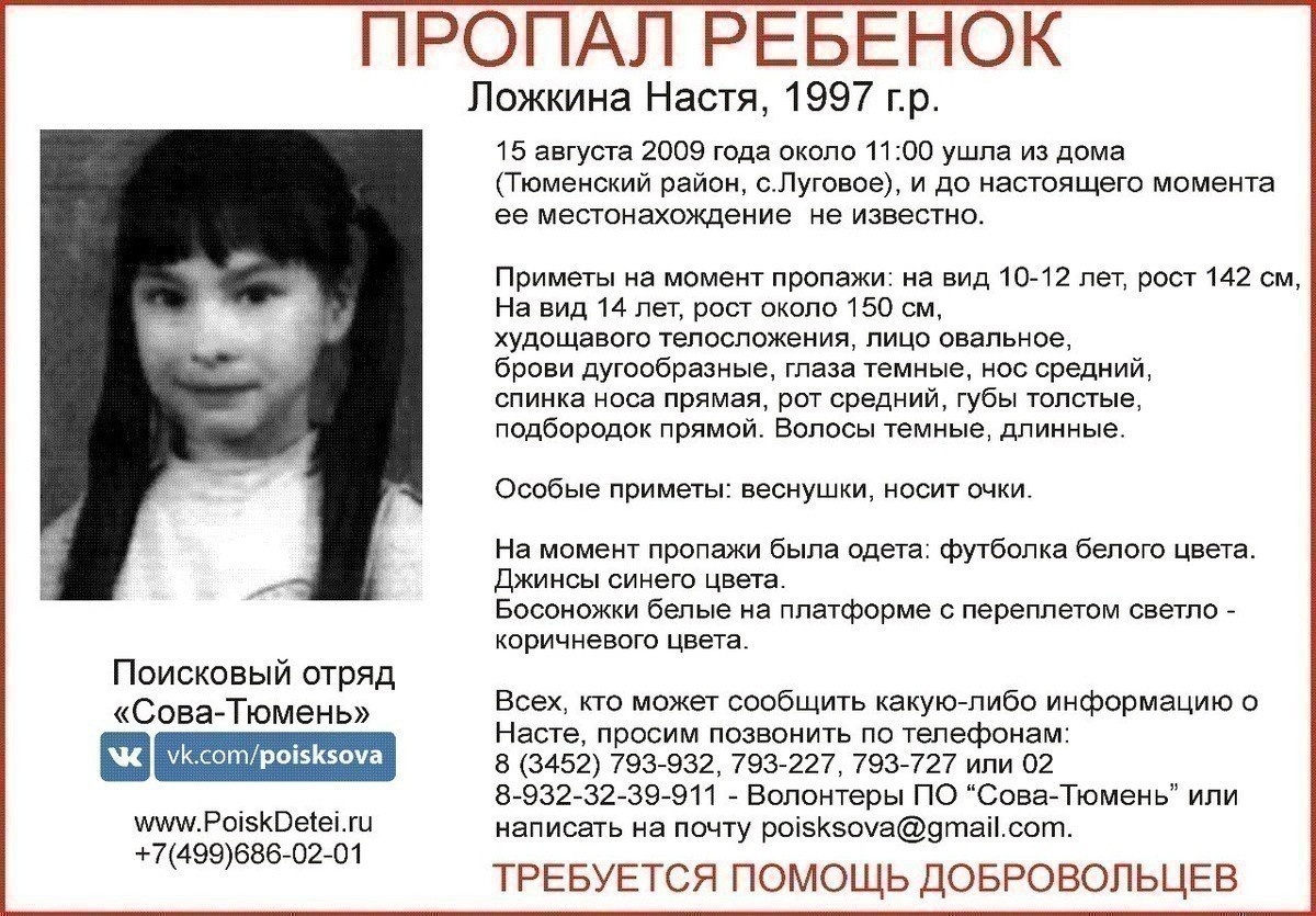 Здравствуйте, друзья. Спасибо Вам за лайки, общение, за доверие и обращения с просьбами на просмотры. Я стараюсь отвечать на все комментарии, Ваши просьбы все фиксирую и по мере своей возможности обязательно буду смотреть и выкладывать. А сегодня у нас снова девочка по имени Настя и снова Тюмень… Поиск многолетней давности, версия по данному заведенному делу – опять же Тюменский маньяк. Известно нам мало что. После почти годовой передышки (пропал без вести Эдик Алимбаев), в 2009 году Тюмень снова «содрогнулась»: ушла в магазин за хлебом и не вернулась Настя Ложкина. Девочке было всего 12 лет. Магазин находился в центре села Луговое, где проживала девочка. Настю видели выходящей из магазина с покупками, но домой в тот день она так и не пришла. По показаниям некоторых свидетелей – Настю видели садящийся в автомобиль, но ни номера автомобиля, ни водителя установить не смогли. Мобильный телефон, который находился при девочке был отключен и перестал отвечать в тот же день, 15 августа 2009 г