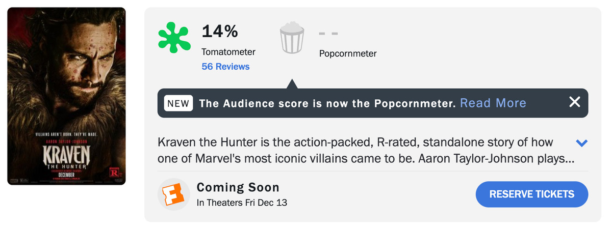 За день до премьеры супергеройский фильм "Крейвен-охотник" получил крайне низкий рейтинг на Rotten Tomatoes — 14%. Хотя это и удручающий результат, картине все же удалось обойти другой фильм Sony — "Мадам Паутина" с ее 11%. В фильме Аарон Тейлор-Джонсон исполняет роль Крейвена, который противостоит Носорогу в исполнении Алессандро Нивола, одновременно разбираясь в сложных отношениях со своим безжалостным отцом Николаем Кравиновым (Рассел Кроу). В актерский состав также вошли Ариана ДеБос (Калипсо), Фред Хехингер (Хамелеон), Кристофер Эбботт и Леви Миллер. Первые отзывы критиков в социальных сетях называют фильм "скучным", "разочаровывающим" и "пустой тратой таланта Аарона Тейлора-Джонсона". По прогнозам Comic Book, картина может показать самые низкие кассовые сборы среди всех супергеройских фильмов Sony, включая "Морбиуса" и успешную трилогию "Венома". Ожидается, что в первый уикенд в США фильм соберет лишь 13-15 миллионов долларов, что может поставить под вопрос будущее киновселенной