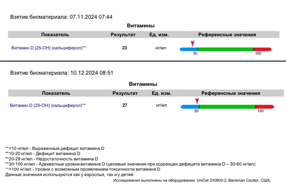 7 ноября: значение = 23 10 декабря: значение = 27 Референсное значение: 30-100 Пью по 5000 единиц 25 дней, но что-то как-то не очень он подрос… Самочувствие: лучше, чем было в начале ноября. Пьем дальше)) Make vitamin D great again💪🏻