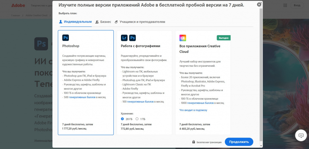 Стоимость Photoshop зависит от выбранного плана. В 2024 году цена стандартной подписки на одного пользователя составляет почти 1800 рублей месяц. Также можно оформить подписку на пакет Adobe Creative Cloud, который включает дополнительные программы: Illustrator, Premiere Pro и другие. Это обойдётся примерно в 4500 рублей в месяц.