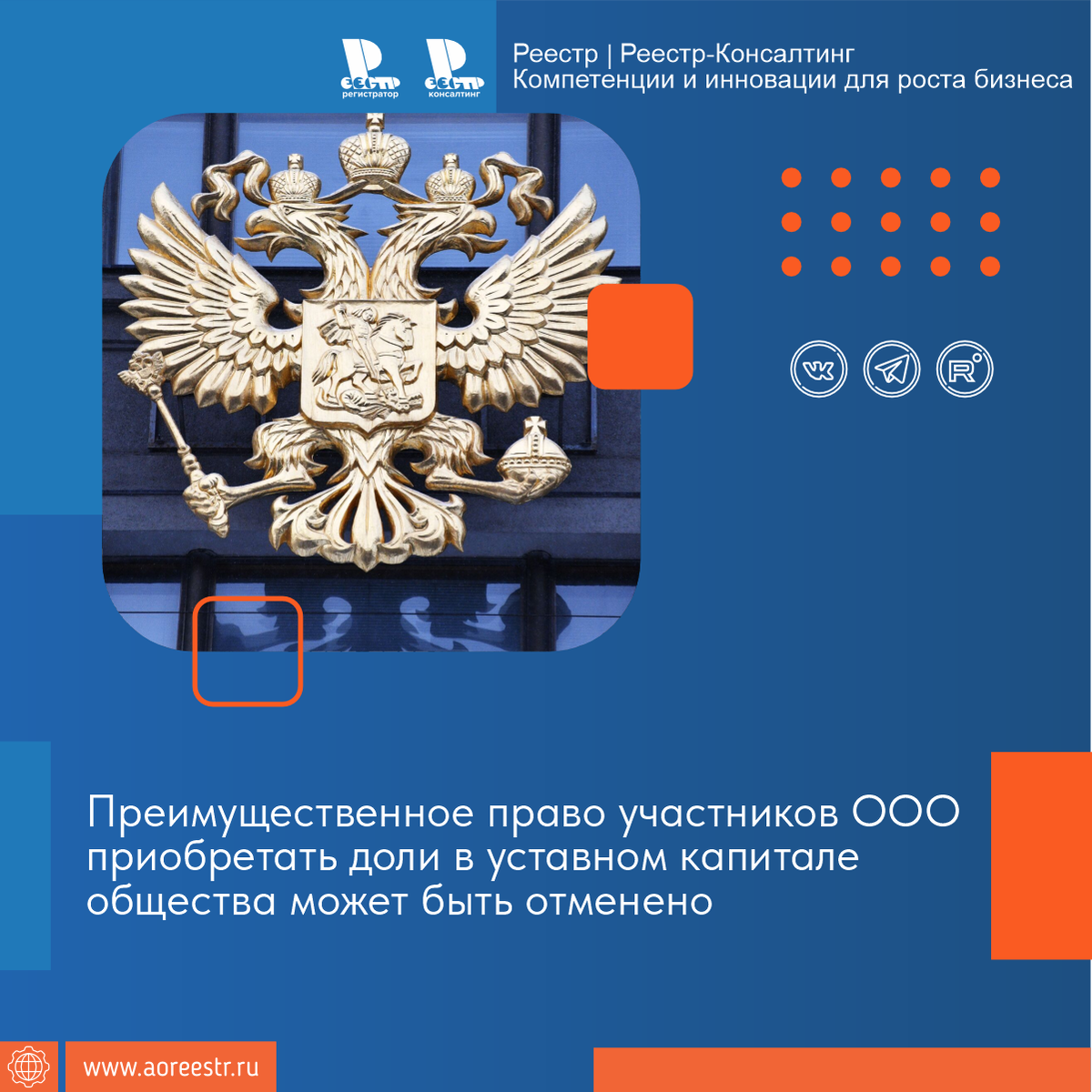 Правительство РФ внесло в Государственную Думу два связных между собой законопроекта: № 788669-8 «О внесении изменений в статьи 663 и 93 части первой Гражданского кодекса Российской Федерации» и № 88656-8 О внесении изменений в статью 21 Федерального закона «Об обществах с ограниченной ответственностью». Законопроекты направлены на обеспечение возможности отмены применения положений действующего законодательства о преимущественном праве участников ООО приобретать доли или части доли в уставном капитале общества. Анализ правоприменительной практики, проведенный разработчиками документов, свидетельствует, что императивное установление в гражданском законодательстве преимущественного права является избыточным при наличии согласия всех участников на вхождение в состав ООО новых участников. Предлагается законодательно установить, что «в отношении одного, нескольких участников общества, прямо поименованных в уставе общества (с указанием имени или наименования, иных сведений, позволяющих их и