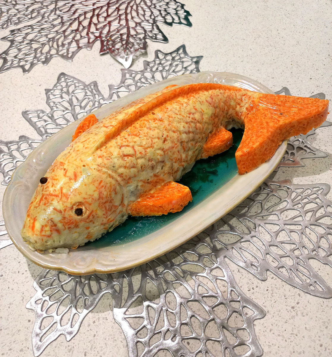 Астрология прочно вошла в нашу жизнь в 90-е годы прошлого века. И многие из нас до сих пор верят, что встречать Новый год нужно, непременно соблюдая традиции, предписанные китайским гороскопом. Одна из них – накрывать праздничный стол с блюдами для ублажения тотемных животных, соответствующих наступающему году. Символом 2025-го считается Змея. Нынче ее требуется угостить красной и белой рыбой дорогих сортов, птицей, овощами, яйцами, орехами. А вот мясные блюда не очень приветствуются, особенно жирные. Дорогую рыбу покупать не будем. Сделаем ее своими руками из самых доступных продуктов. Это будет формовой рыбный салат. Для сборки салата потребуется пластиковая форма в виде рыбки. Оставшийся желатин и рыбный сок из консервной банки смешайте, добавьте каплю синего пищевого красителя. Вылейте получившуюся жидкость на блюдо, предназначенное для подачи салата. Когда желатин застынет, это будет съедобное синее море. Для антуража в него можно добавить морскую капусту, мидии, креветки, щупал