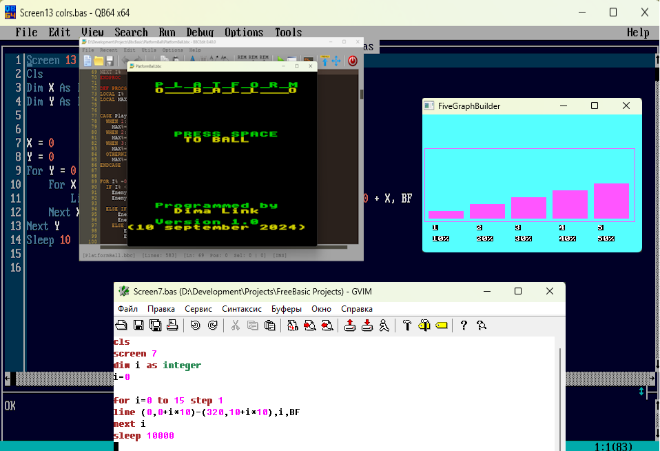 Удобно использовать Фри Бэйсик для обучения таким вещам. Вырисовывается такая комбинация. КБ64 – готовая среда разработки. Все из программы среды делается. А, потом, посложнее и поинтереснее, когда освоился. Это фри Бэйсик. Сам выбираешь среду разработки. Сам компилируешь, делаешь мэйкфайл. Интересный и позитивный опыт.