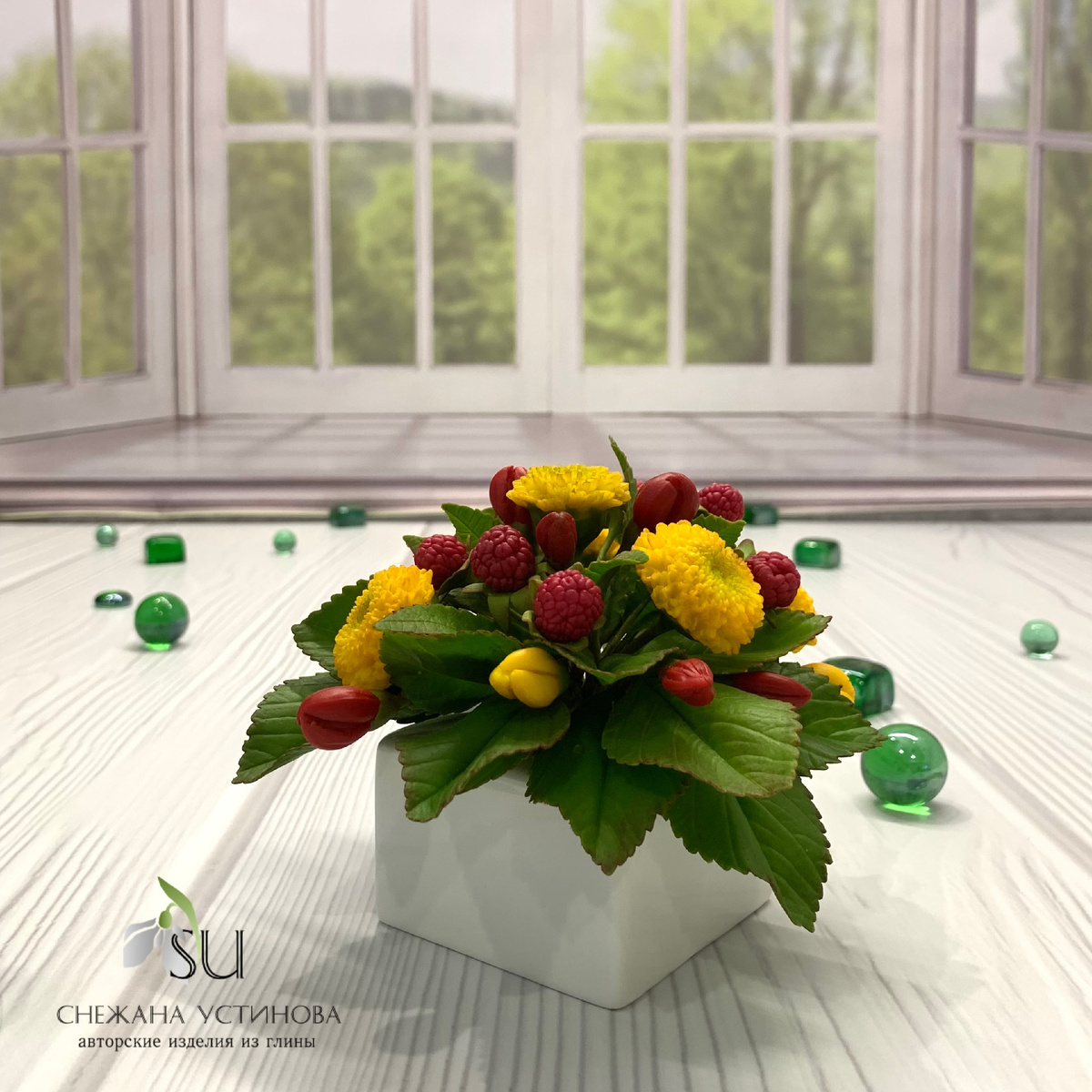 Одним прохладным утром, когда солнце еще только начинало пробираться сквозь туманные завесы, ко мне пришло вдохновение. Вдохновение, которое толкнуло меня создать нечто особенное, что захватывает и удивляет своей красотой. Я решила, что это будет композиция из холодного фарфора—материала, который я полюбила за его возможность ожить в руках мастера. Назвала я это творение "Хамелеон", потому что хотелось, чтобы оно смогло удивлять и восхищать, как хамелеон, меняющий свои окраски. Первым делом я взялась за желтые хризантемы. Эти солнечные цветы уже сами по себе выглядят как маленькие солнца, и каждый их лепесток манит своей яркостью. Я аккуратно формировала каждый лепесток, придавая им нежность и естественность, как будто они только что рассвели в осеннем саду. Когда я прикрепила их к веточкам, хризантемы выглядели так, будто способны согреть даже самый хмурый день. Далее я добавила ягоды малины—еще один элемент, который обожаю за его смелость и сладость. Малиновые ягоды в этой композиции