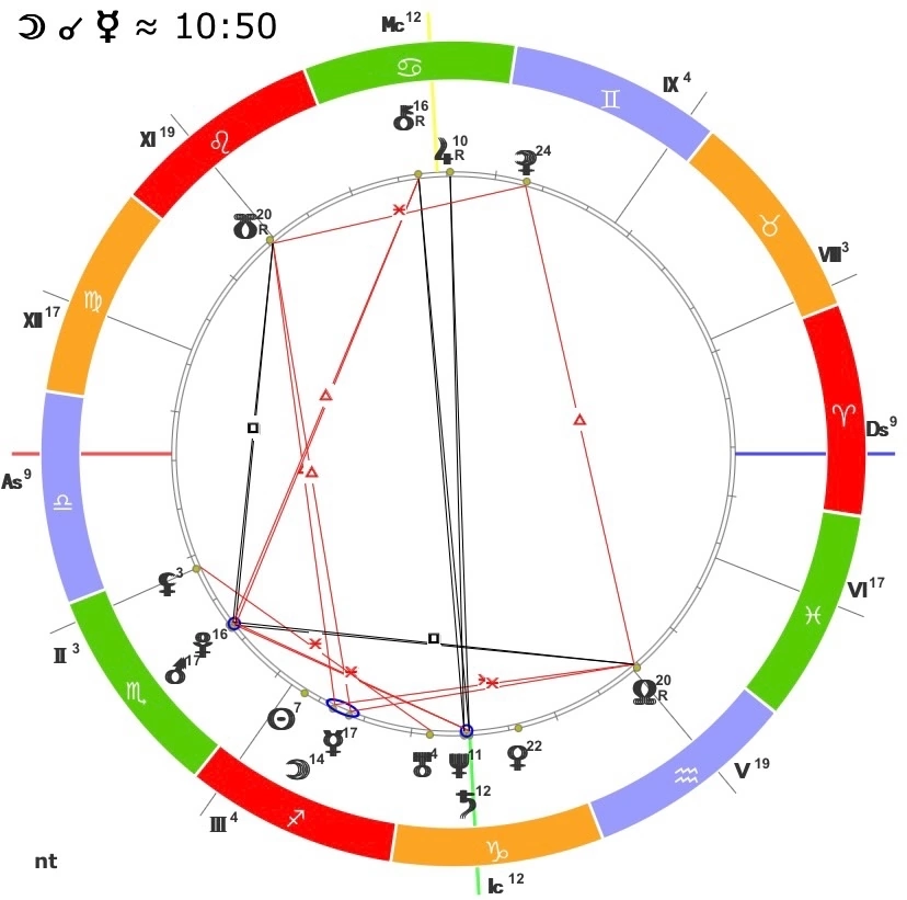 Венера в шахте в Козероге в 4 доме, Сатурн в 3 доме в 1 градусе от куспида 4 дома в соединении с Нептуном, в оппозиции с Юпитером. Мы видим, что диспозитор Венеры (Сатурн) сильно поражён, к нему прилепился Нептун, который его размывает, да ещё имеет оппозицию с Юпитером. Могу тут сразу сказать, у человека проблемы с правдой и с семьёй. Человек чувствует себя одиноко в семье, ему не хватает поддержки, он всё тянет на себе, часто сталкивается обманами, слишком доверчивый и недальновидный в некоторых вопросах, хотя глупым его назвать нельзя, довольно умный человек. Но довольно импульсивный в действиях и все проблемы создаёт себе сам, чего в упор не видит, идёт перенос на других людей. То есть, как я говорила, планета в шахте зависима от своего диспозитора довольно ярко. В данном случае, человек контролирует процессы в семье, но он не говорит о том, что ему нужно от других, а ждёт, когда они это сделают сами. Они этого не делают и они плохие, а он бедный всё на себе тащит. Да только вот загвоздка, что всё, да не всё. Человек не видит, что делают другие для него, так как у него по Венере есть представление довольно чёткое, что они ДОЛЖНЫ делать и как они ДОЛЖНЫ это делать. При этом, как видите, человек очень талантливый, на самом деле семейный, но жуткий контролёр, при этом, при том ещё и скрытный. Но несмотря на это, у него есть такая фишка как советоваться с близкими. Только тут человеку нужно ещё научиться делать это искренне и действительно прислушиваться. Данный человек манипулятор и бизнесмен. Здесь человек вкладывается в семью, но исключительно по своим представлениям, он мало руководствуется тем, что действительно нужно семье, он навязал им то, что им нужно и они играют по его правилам, при этом его это одновременно бесит и одновременно удовлетворяет его потребность в ощущении своей ценности. Сильная личность, очень умная личность, очень эрудированная, легко решает глобальные вопросы и видит ситуацию в целом. Строит вокруг себя всех родных, для него нет авторитетов, кроме тех, кто для него сейчас выгоден, то есть тут притворство. Если такой человек решит поменять свои установки ценности самого себя внутри своей семьи, то начинать ему следует с Луны понятно дело, тут и говорить не о чем, но также с Венеры и Юпитера, Сатурн там сам потом подтянется. Это именно в данном случае реализации человека, потому что если бы человек немного иначе проигрывал бы свои положения, то мы могли бы дать немного другую рекомендацию. Тут нужно смотреть на проблему и правильно расставлять акценты. Вот именно с точки зрения этого человека с его картой, нас интересует Венера и Юпитер. Человеку нужно научиться прислушиваться к родным и дать им самостоятельность и, поначалу, так как он уже научил их какие у кого роли, это будет проблематично, потому что сценарий того как кто себя ведёт уже выработался у группы людей, а не только у него, но постепенно это сделать можно. Он должен снять с себя такой груз, который несёт и дать своим родным самостоятельность, потому что планета в шахте очень самостоятельная на самом деле, просто при отсутствии связей ей сложно психологически понять других, до неё туго доходит то, что за пределами диспозитора. Ну, а по Юпитеру ему нужно научиться считаться с мнением других и их авторитетом в каких-то вопросах, снизить токсичную критичность.