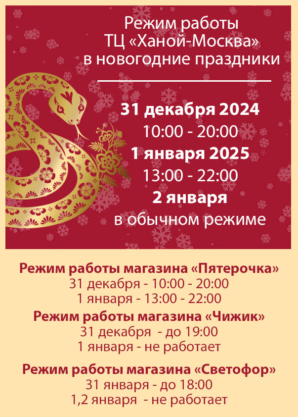 Дорогие гости «Ханой-Москва», поздравляем вас с наступающим Новым годом и информируем о режиме работы торгового центра в праздничные дни: 31.12.2024 – с 10-00 до 20-00 01.01.2025 – с 13-00 до 22-00 С 02.01.2025 – в обычном режиме Режим работы магазина «Пятерочка» 31.12.2024 – с 10-00 до 20-00 01.01.2025 – с 13-00 до 22-00 С 02.01.2025 – в обычном режиме Режим работы магазина «Чижик» 31.12.2024 – с 10-00 до 19-00 01.01.2025 выходной С 02.01.2025 – в обычном режиме Режим работы магазина «Светофор» 31.12.2024 – с 10-00 до 18-00 01.01.2025 и 02.01.2025 выходной С 03.01.2025 – в обычном режиме Ждем вас в «Ханой-Москва»!