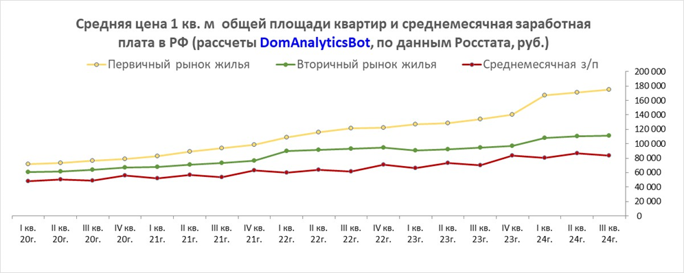 После того как мы выяснили, что жилья для россиян построено недостаточно даже чисто арифметически (читайте об этом в 1-й части – Обеспеченность россиян жильём), давайте посмотрим, как обстоят дела с финансовой стороной вопроса – а именно, есть ли у граждан средства на приобретение квартиры, и как в динамике рост зарплат соотносится с ростом цен на недвижимость. Предлагаю взглянуть на вопрос с точки зрения цифр, а не эмоций, без которых редко обходится обсуждение данной темы. Сравним среднемесячные зарплаты граждан и цены за квадратный метр на первичном и вторичном рынке за последние 5 лет (см. график): § цена за 1 метр квадратный на первичном рынке выросла в 2,4 раза, на вторичном – в 1,8 раза, а заработная плата за месяц – в 1,7 раза; § разрыв между ценой за 1 кв. метр на первичном рынке и средней заработной платой увеличился с 23 тыс. рублей до 93 тыс. рублей (т.е. в 2020 г. квартиру в новостройке в 33 кв. м. можно было приобрести в среднем за 49 зарплат – 4,1 года, а к концу 2024 г