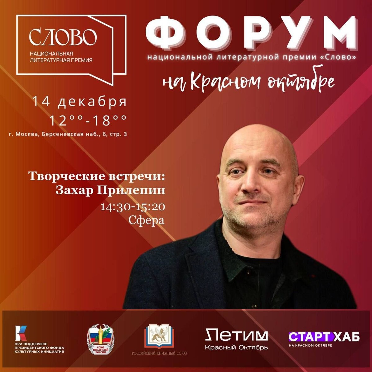 14 декабря с 14:30 до 15:20 на площадке Сфера пространства СтартХаб на Красном октябре пройдет творческая встреча с прозаиком и общественно-политическим деятелем, актером и музыкантом, Захаром Прилепиным. В 2022 году автор книг «Обитель», «Санькя», «Патологии» и других был назван «Писателем года». Захар Прилепин занимается гуманитарной помощью жителям Донбасса, а также числится заместителем командира полка особого назначения Росгвардии. Приглашаем всех на встречу! Вход по обязательной регистрации.
