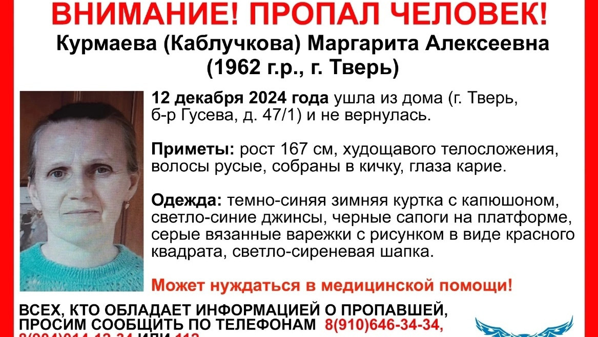 12 декабря в Твери ушла из дома по адресу бульвар Гусева-47/1 и не вернулась 62-летняя Маргарита Алексеевна Курмаева. Ориентировку опубликовал еще вчера тверской волонтерский поисково-спасательный отряд "Сова". Сегодня "совы" обратились к тверичанам с просьбой помочь найти женщину. "На улице очень холодно! С каждым часом состояние женщины может быть все хуже! Она нуждается в медицинской помощи! Пожалуйста, будьте максимально внимательны, смотрите по сторонам, обращайте внимание на свое окружение. Если встретите ее, не отпускайте, сразу сообщите на 112 или на отрядные телефоны ВПСО "Сова"", - написали волонтеры в соцсети. Приметы: рост 167 см, худощавого телосложения, волосы русые, собраны в кичку, глаза карие. Одежда: темно-синяя зимняя куртка с капюшоном, светло-синие джинсы, черные сапоги на платформе, серые вязанные варежки с рисунком в виде красного квадрата, светло-сиреневая шапка. Телефоны отряда "Сова": 8 (910) 646-34-34 и 8 (904) 014-12-34