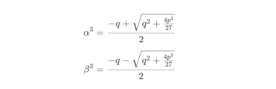 В посте про решение уравнений 3-й степени мы полностью вывели формулу нахождения корней. Как известно, в уравнениях любой степени количество корней равно максимальной степени уравнения. В квадратном уравнении степень многочлена равна 2, следовательно, у уравнения до двух корней; в кубическом уравнении — 3 корня. Но как их найти? В том же посте про кубические уравнения мы ввели две новые переменные: α, β. В прошлый раз для того, чтобы найти, чему равны α и β, мы брали арифметический корень. Также мы знаем из прошлого поста, что все алгебраические корни равномерно расположены на окружности, и, зная хотя бы один из корней и степень корня, мы можем найти все остальные корни. Пусть d₁ — это первый корень, а k — показатель степени корня, тогда: Таким образом, для переменных α и β получаем: Мы нашли алгебраические корни α³ и β³. На данном этапе мы успешно определили все алгебраические корни α и β кубического уравнения, используя равномерное распределение корней на окружности. В след. посте