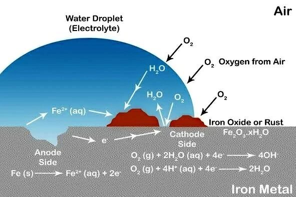- Гальваническая коррозия: когда два разных металла соприкасаются друг с другом и между ними находится что-то вроде воды или соли. Например, стальные болты ржавеют при контакте с алюминием в соленой воде.