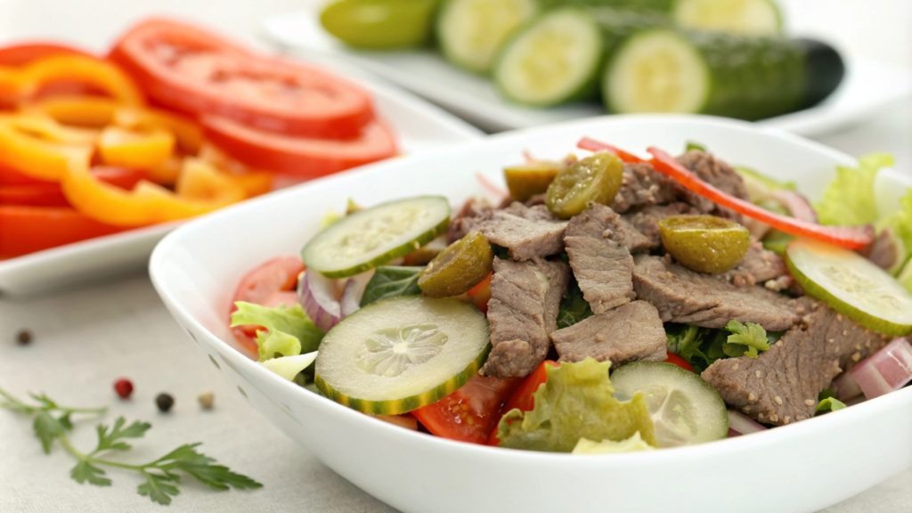 Мясной салат с говядиной и солёными огурцами
