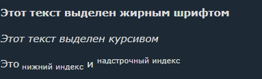 HTML содержит несколько элементов для определения текста с особым значением. Пример: Элементы форматирования были разработаны для отображения специальных типов текста: Элемент HTML <b> выделяет текст жирным шрифтом, не придавая ему особого значения. Пример: <b>Этот текст выделен жирным шрифтом</b> Элемент HTML <strong> определяет текст, имеющий большое значение. Содержимое внутри обычно выделяется жирным шрифтом. Пример: <strong>Этот текст очень важен!</strong> Элемент HTML <i> определяет часть текста в альтернативном стиле или настроении. Содержимое внутри обычно отображается курсивом. Совет: тег <i> часто используется для обозначения технического термина, фразы на другом языке, мысли, названия корабля и т. д. Пример: <i>Этот текст выделен курсивом</i> Элемент HTML <em> определяет выделенный текст. Содержимое внутри обычно отображается курсивом. Совет: программа чтения с экрана произнесёт слова в <em> с ударением, используя словесное ударение. Пример: <em>Этот текст выделен</em> Элеме