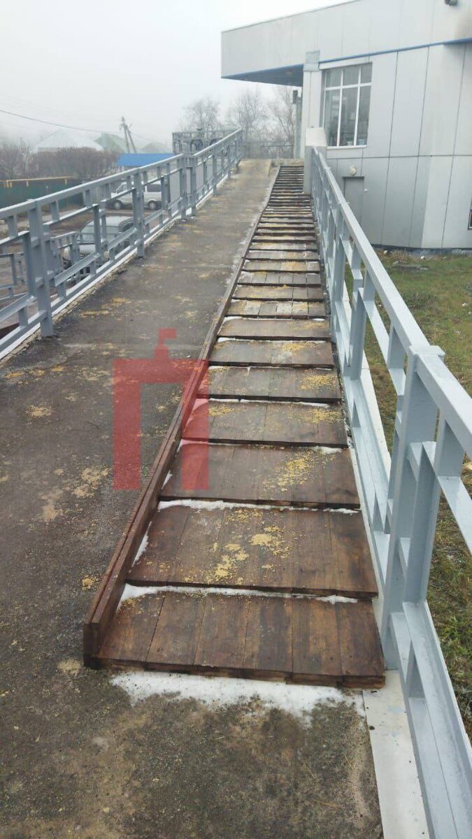 Тем не менее, в здании есть действующий вход, но выглядит он тоже сомнительно. Находится он с другой стороны от лестницы. Импровизированная платформа из досок не внушает доверие, особенно в зимний период. После осадков и мороза ее посыпали песком, но ходить по ней все еще опасно.