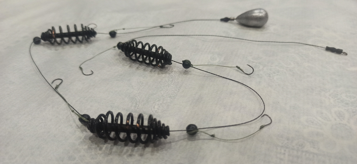 Сегодня решил разобрать популярный донный монтаж, именуемый в народе как "убийца карася". В классическом варианте это три кормушки в линию с крючками возле них. Кормушка забивается прикормкой, на которую приходит рыба, в непосредственной близости рыба видит насадку/наживку и в итоге соблазняется. За раз удается достать 2-3 карася. Для монтажа использовались следующие расходники: Плетёная леска 0.28мм как основа, порядка метра; Плетёная леска 0.14мм для поводков, порядка метра; Три кормушки-пружины длиной 3см; Шесть резиновых бусин диаметром 4-5мм; Свинцовая оливка с вертлюгом весом 24гр (в рамках теста моего удилища); Связав поводки с крючками, а их будет шесть, собираю монтаж: К вертлюгу оливки привязываю плетёнку-основу, далее в десяти сантиметрах выше закрепляю бусину. Следом идёт кормушка и бусина, привязанная подобным узлом. Отступаю десять сантиметров и повторяю: бусина-кормушка-бусина. Повторяю процедуру ещё один раз и, отступив от верхней бусины пятнадцать сантиметров , привязы