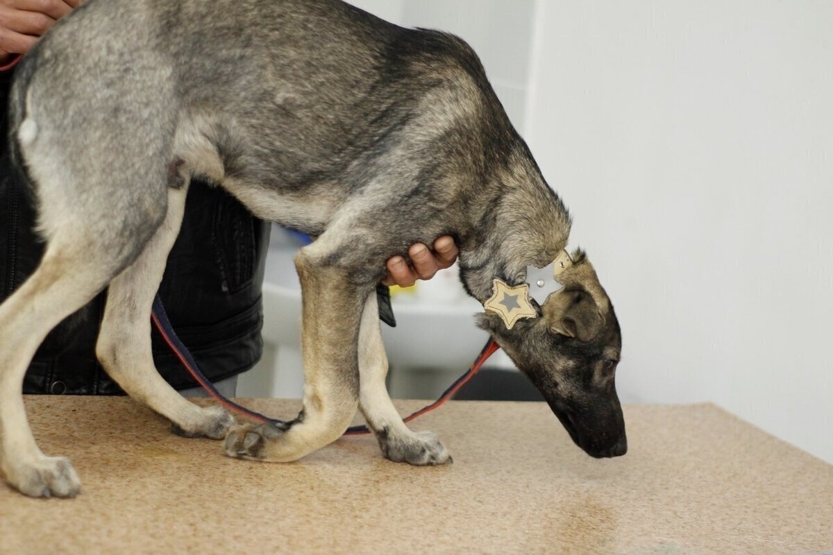 Квину установили наружную металлоконструкцию на 1,5 мес. За это время кости должны были срастись. Квин был он зашуганным долговязым щенком-подростком. Долго привыкал к людям и заодно носил конструкцию, которая помогала кости срастись.