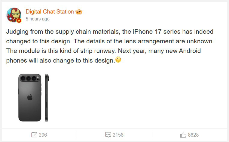 По информации из цепочки поставок Apple, серия iPhone 17, анонс которой состоится в сентябре 2025 года, может получить значительные изменения во внешнем виде. А главным нововведением станет полная перекомпоновка блока камер на задней панели. Инсайдер Digital Chat Station опубликовал на Weibo изображение предполагаемого дизайна iPhone 17, где основным отличием является вертикальное расположение камер, которое мы уже видели на прошлых набросках. Ранее также сообщалось, что iPhone 17 Pro может получить частично алюминиевый корпус вместо титанового, хотя это решение еще не окончательное. Наличие различных прототипов — обычная практика для Apple. Компании еще предстоит выбрать тот вариант дизайна, который лучше всего соответствует фирменному стилю iPhone. Учитывая возможный выход сверхтонкого iPhone 17 Air в следующем году, изменение конструкции может быть оправданным. Перемещение основных компонентов камеры в верхнюю часть позволит Apple сделать выступ камеры больше только в этой области,