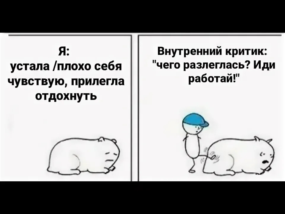 Внутренний критик вырастает с опорой на опыт критики из вне от значимых фигур детства, но здесь есть и другая сторона, тот компонент, который я уже упомянула - реакция на эту критику из вне.