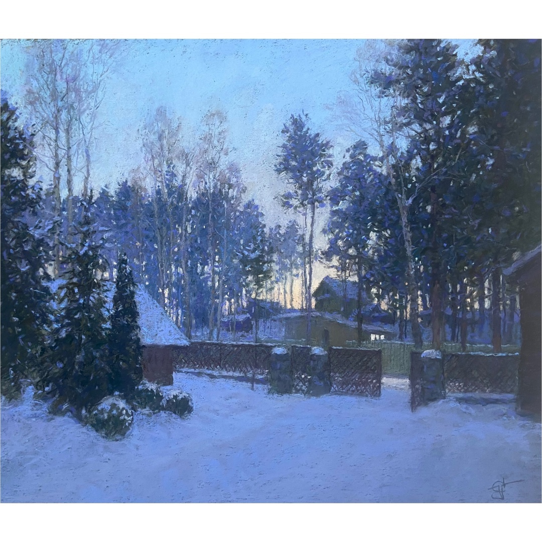 Иллюстрация - новая картина Сергея Усика "Зимний вечер на даче". Холст, пастель, 45х54