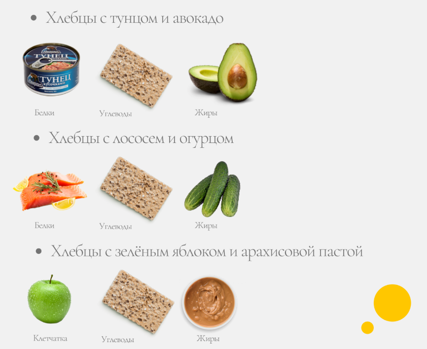 - Медленные углеводы (но так как перекус обычно быстрый, то организовать крупы достаточно сложно, поэтому упор надо сделать на белковые продукты)